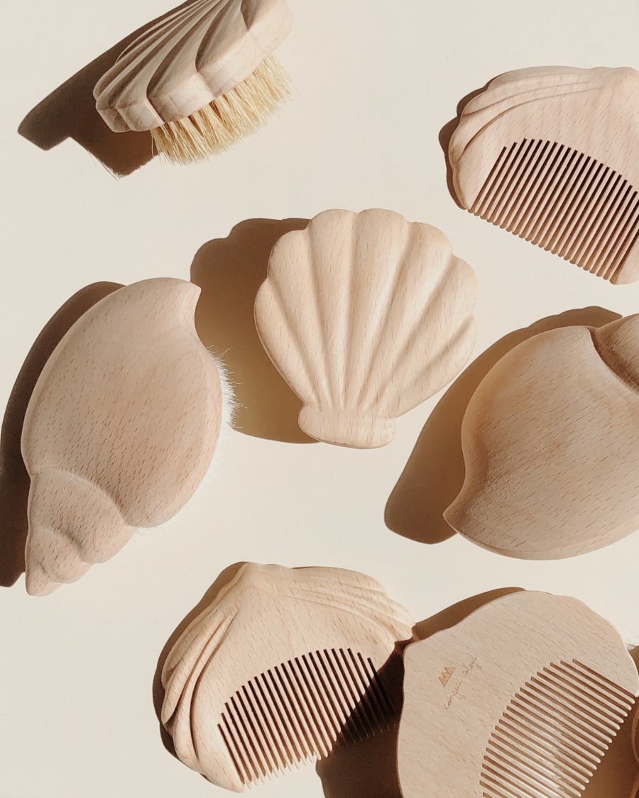 Beim Kopenhagener Label KONGES SLØJD bekommt Beachcombing, das Lieblingshobby unserer Kindheit, eine ganz neue Bedeutung. Denn jetzt holen wir Kammmuschel, Herzmuschel und Schneckenmuschel nicht nur zum Bestaunen aus dem Setzkasten, sondern zur morgendlichen Beauty-Routine. Eine weiche Babybürste mit feinem Ziegenhaar, eine Nagelbürste mit Schweinshaarborsten und ein Holzkamm bilden das dreiteilige Brush Set im Conchylien-Design. Zu kaufen z.B. beim Family Concept Store Smallable.