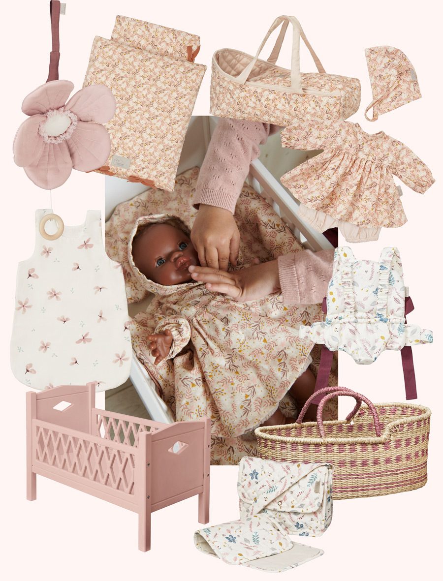 Es muss ja nicht gleich ein ganzer Kofferraum voll sein wie bei Bibigirl und Bubiboy. „Ich will mehr Sachen“ lautet aber ein Standardsatz junger Puppeneltern. Und Weihnachten ist sowieso der beste Anlass um Annabelle neu auszustatten. Aber wenn schon, dann bitte in Bio-Qualität. Und bloß nicht zu pappig-puppig. Stilbewusst füllen die Dänen unsere Puppenschränke mit vornehmer Cottagecore-Romantik: und zwar vom Lätzchen bis zum Moseskorb aus natürlichem Seegras …