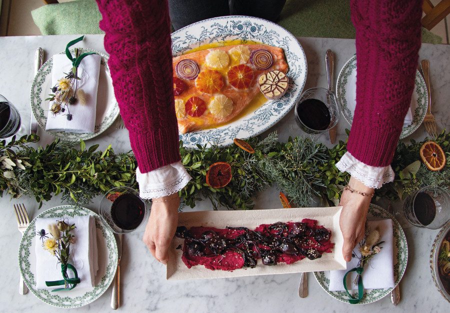 Natürliche Weihnachtsdeko für die Festtafel: Theresas Girlande vom Lande macht Lachsfilet und Wurzelgemüse Konkurrenz