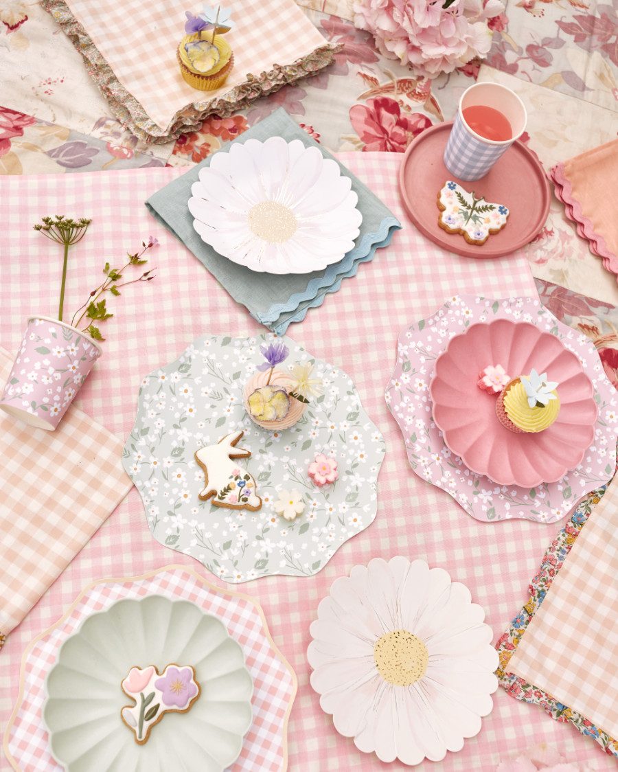 Damit die Tonne im Park endlich aufatmen kann, serviert Meredithe Stuart-Smith zu Ostern 2022 am Puls der Zeit: die vollständig kompostierbaren Partyteller aus Bambus, Zuckerrohr und Holzfaser sind mit Soja-Tinte gefärbt. Anstelle der obligatorischen Papierservietten reicht die Party-Expertin Leinen-Servietten im nostalgischen Gingham-Print samt Liberty-Rüsche – Ostern kann so stylisch sein!