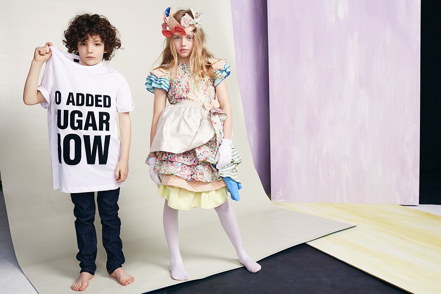 Man könnte meinen, dass man in der Welt von Alice gelandet ist. Im Wunderland, wo die Dinge nicht so sind, wie sie scheinen. Diesen Sommer spielt das britische Label NO ADDED SUGAR mit Illusionen und schöpft aus der Pop-Art der Sechziger Jahre. Wenn die Sechziger schon mal als „das innovativste Jahrzehnt“ überhaupt bezeichnet wurden, so nimmt es kein wunder, dass sie nach wie vor als wichtigste und unerschöpfliche Inspirationsquelle für Kunst und Handwerk herhalten. Die Pop Couture-Kreationen des Londoner Kindermodelabels spiegeln sich perfekt im schöpferischen Potential dieser Tradition wider.