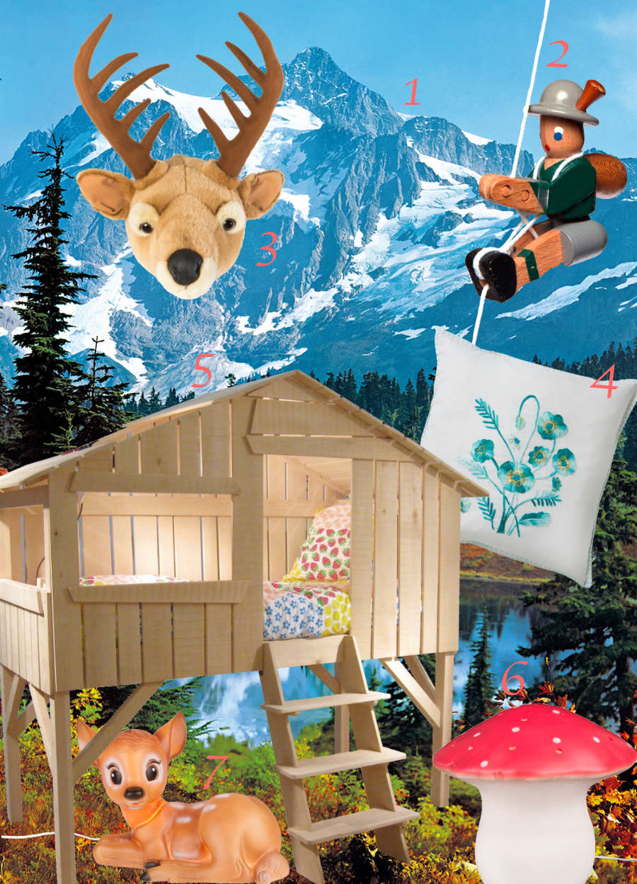 Alle Produkte sind hier verlinkt: Klick‘ einfach auf die Links und gelange so zu deinem Wunschobjekt – 1 Fototapete Mountain Peak von Wizard & Genius via Your Decoration | 2 Bergsteiger Kletterfigur via Obacht | 3 Hirsch-Trophäe von Wild & Soft | 4 Kissenbezug von Rice | 5 Hüttenhochbett von Mathy By Bols | 6 Fliegenpilz-Lampe von Egmont Toys | 7 Kinderlampe Rehlein von Egmont Toys.