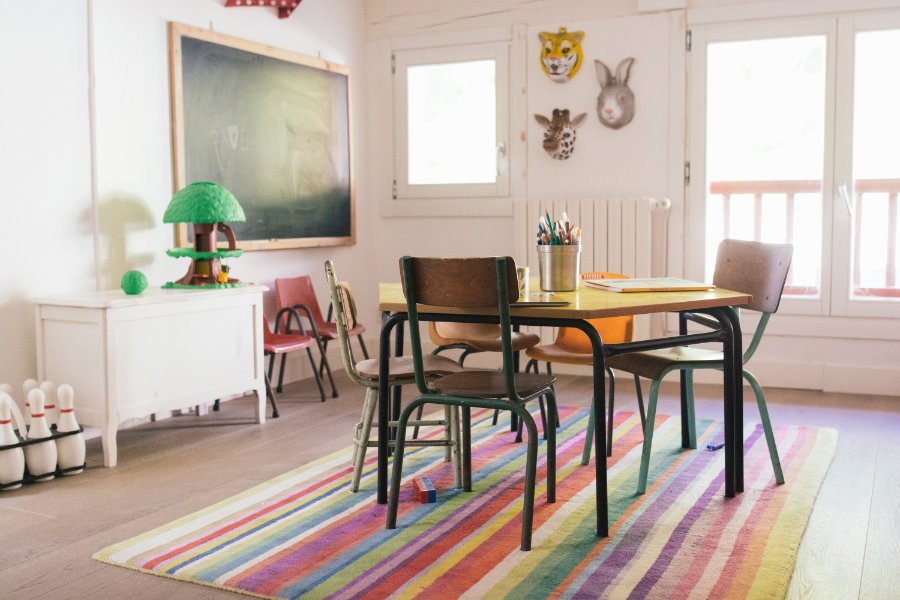 Eigentlich könnten Kinder auch am Küchentisch malen und basteln. Wenn sie von Zeit zu Zeit unter sich sein möchten, kommt ein kleiner Arbeitsplatz im Mini-Format ganz gelegen. Schön, wenn wie in diesem Beispiel, genug Platz für alle da ist, dann kann auch mal das Mittagessen für die kleinen Workaholics direkt an die Werkbank geliefert werden …