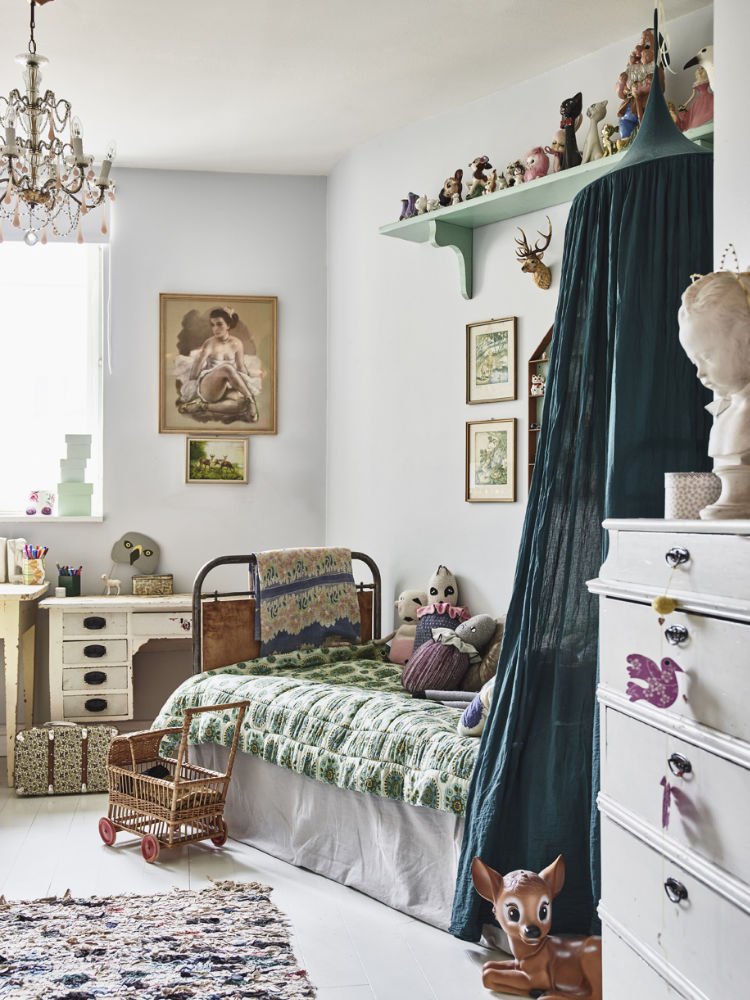 Wer sagt denn, dass Aufräumen spießig ist. Dieses Kinderzimmer im Boho-Style beweist das Gegenteil: Ordnung kann ganz schön lässig aussehen! Man nehme ein paar schicke Vintage-Koffer vom Marché aux Puces, Retro-Regale in Pastell oder den antiken Puppenwagen. „Originell verstauen“ lautet hier die Devise!