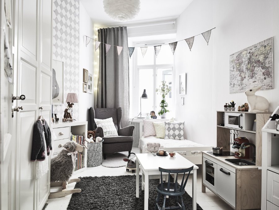 Ein Zimmer für alle: Während sich der Enkel als Bocuse versucht, kann es sich Opa im Ohrensessel gemütlich machen. Foto © Anders Bergstedt, Kinderkram, Gestalten 2018