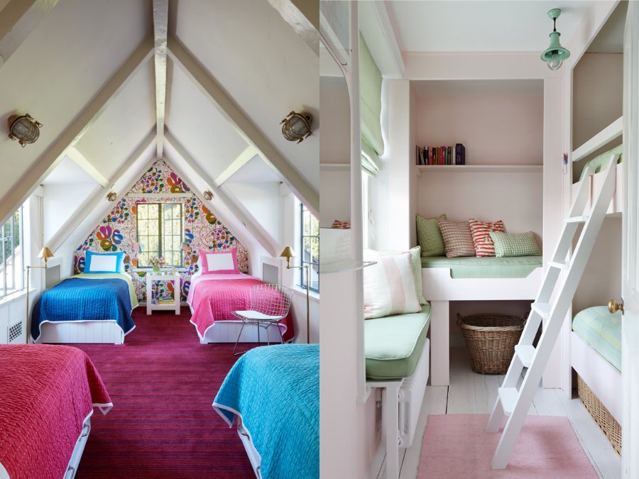 Hier fühlen sich die kleinen Bewohner wie im Märchen. Für das Dachgiebel-Schlafzimmer in einem Gästehaus in Los Angeles hat Dekorateur David Netto tief in den Farbtopf gegriffen. Blaue und pinke Tagesdecken und eine Blumentapete leuchten mit dem passenden Teppichboden in Violett-Burgunderrot um die Wette. Eine ebenfalls geniale Schlafzimmerlösung auf knappem Raum ist den Innenarchitekten für eine Fischerhütte in Devon gelungen. Praktische Einrichtungstipps im wahrsten Sinne des Wortes …