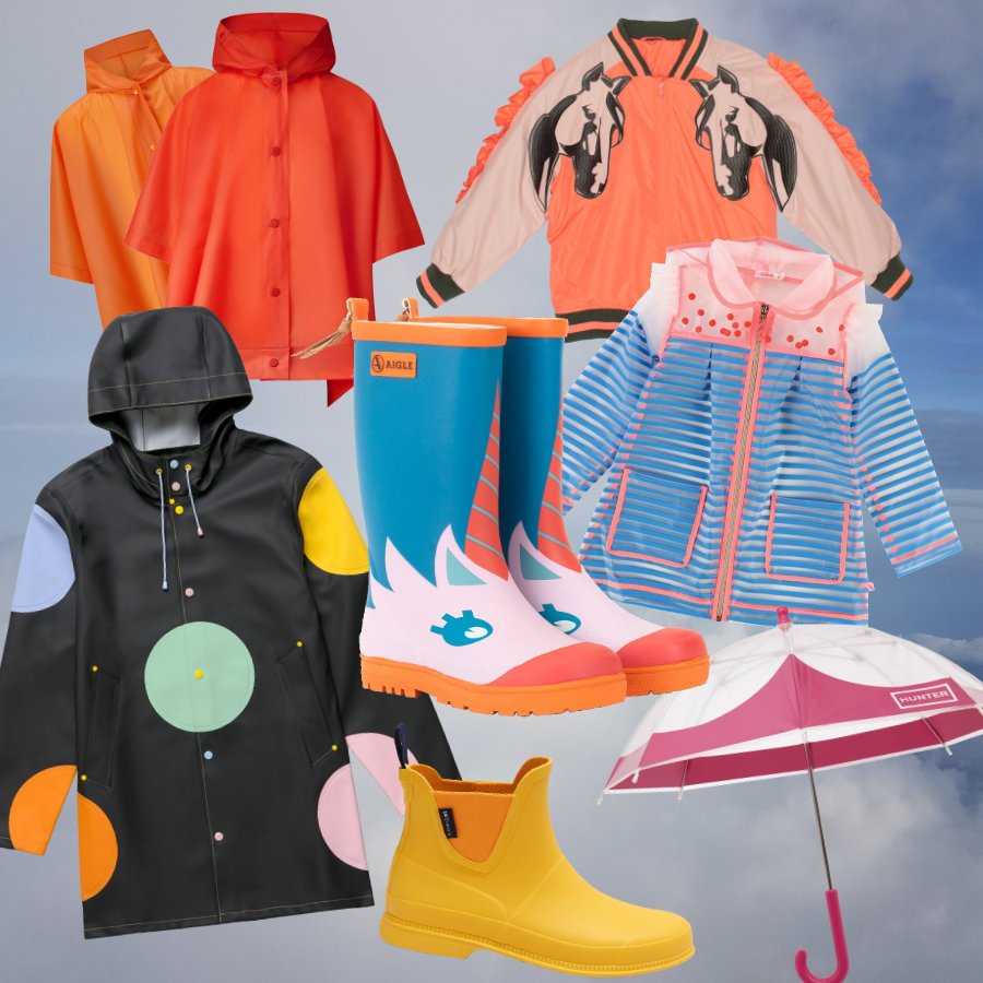 Bunt und verspielt dürfen sie sein, die Regenjacken für Kinder, aber auch wir Erwachsene wollen dann und wann in eine farbenfrohe Pop-Welt entfliehen (von oben nach unten im Uhrzeigersinn): Wasserfeste Bomberjacke von Gosoaky | Regenjacke von Billieblush | Kinder-Gummistiefel von Aigle | Kinder-Regenschirm von Hunter | Damen-Gummistiefelette von Tretorn | Unisex-Regenmantel von Stutterheim X Happy Socks | Kinder-Regenponcho von Hunter.