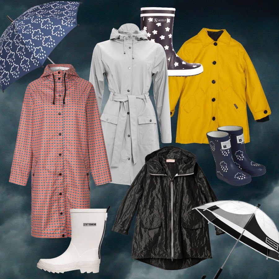 Sind ebenso cool wie funktional – Regenjacken für Kinder und Erwachsene, die erst dann Lust bekommen vor die Tür zu gehen, wenn es so richtig stürmt und niederprasselt (von oben nach unten im Uhrzeigersinn): Unisex-Regencape von Gosoaky | Hero Mask & X-Raincoat von Beau Loves | Chelsea Regenboots für Kinder von Tretorn | Gefütterte Kinder-Regenjacke von Stutterheim | Damen-Gummistiefel von Stutterheim | Wasserfeste Gürteltaschen von Rains | Unisex-Regenparka von Rains.