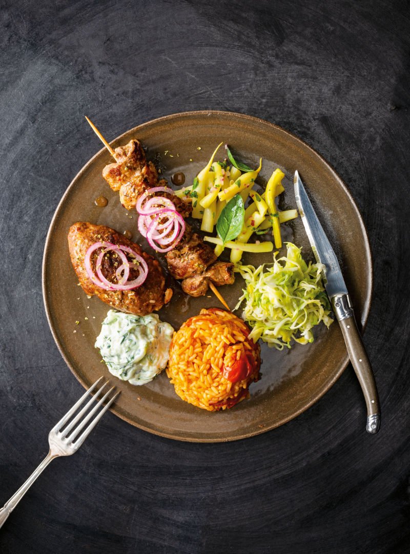 Bifteki, Souflaki, Bohnen, Krautsalat, Tomatenreis und Tzatziki: der griechische Teller als Klassiker des Baukastenprinzips