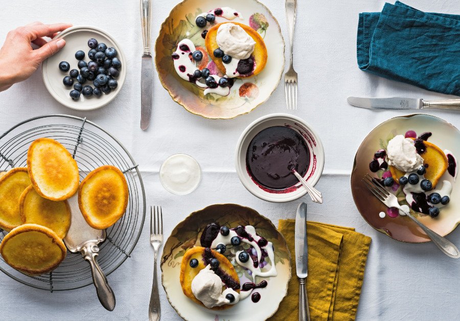 Herb-säuerliche Blaubeeren und die milde Süße von Bananeneis zu Pfannküchlein, soeben aus der Pfanne gehüpft – das schmeckt!