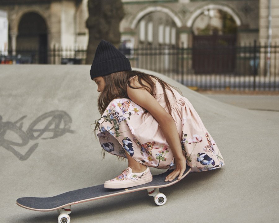 Heute ist der Checkerboard-Print fest in der Vans-DNA verankert. Ein Klassiker, der bereits mehrfach neu interpretiert wurde: mal mit grünen Zehen auf einem Hulk-Treter, mal ganz in Regenbogenfarben. Kein Wunder, dass man auch in der brandneuen Kooperation mit dem dänischen Kindermodelabel dieses Signature-Muster wiederfindet: Berühmt für seine expressiven Fotoprints, lässt Molo Mädchen wie Jungs in den Old Skool Sommer-Sneaker samt Skater-Szenerie schlüpfen …