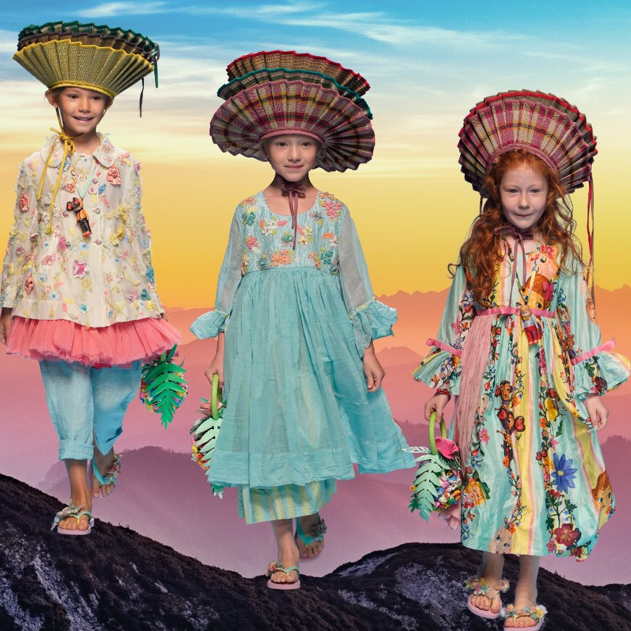 „No Pesticides! No Pesticides! …“ rufen die jungen Stimmen im Chor. Fast könnte man meinen, auf einer Greenpeace-Demo gelandet zu sein, überall Protestschilder auf denen steht: „FREE BEE“ oder „BEE KIND“. Das Badass-Avantgarde-Label Infantium Victoria hat zum Environmental March aufgerufen, mitten im Trubel der Kindermodemesse Pitti Bimbo. Julia Gaydina, eine der beiden Gründerinnen, feuert die aufgeweckte Model-Truppe an, noch lauter zu protestieren. „Unsere Kollektion „No Pesticides“ ist ein Appell, den Einsatz giftiger Stoffe in der Landwirtschaft einzustellen“, sagt die Designerin, die zusammen mit Dinie van den Heuvel zu den Vorreitern veganer Öko-Mode gehört und nächstes Jahr Kleider aus Lotusblüten auf den Markt bringen wird. Wie viele andere Kindermodelabels auf der Pitti Bimbo 89 setzt Infantium Victoria die Sommer Trends für 2020 nicht nur durch extravagante Details oder Volumen, sondern vor allem in Sachen Nachhaltigkeit.