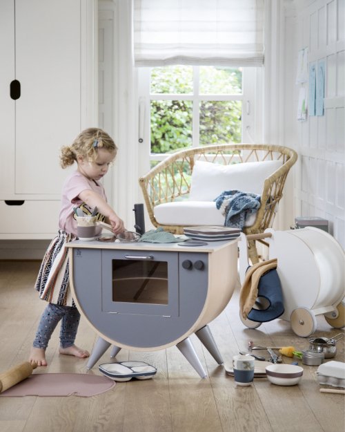 Lakritzstreusel oder Blaubeersauce? Das Farbgamma des Interiorlabels Sebra ist zart wie dänisches Softeis, das Design unkompliziert wie Smørrebrød: harte Kanten, verschnörkelte Details – Fehlanzeige, stattdessen setzt Designerin Mia Dela auf kindgerechte organische Formen. Auch die Kinderküche der Dänin ist rundum gelungen. Auf dem schlichten Holzkörper können die kleinen Küchenchefs alles in einem Abwasch erledigen: Spülen, Kochen, Backen … und damit die „Kanelsnegle“ nicht verbrennen, besitzt der Backofen ein großes Sichtfenster.