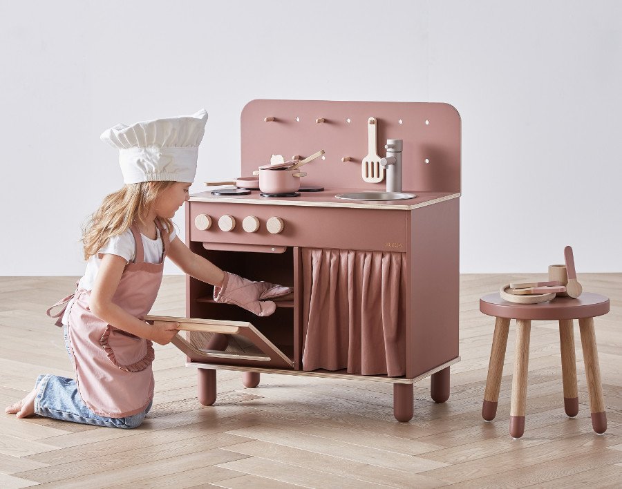 Egal ob Zimtschnecken mit Mayo oder Heringsfilets mit Nutella – kochbegeisterte Kinder können hier ihre grenzenlose Fantasie vollends ausleben. Und die Eltern? Die stellen, wenn sie besonders designaffin sind, das zurückhaltende Spielküchen-Modell im Midcentury Style nicht ins Kinder-, sondern ins Wohnzimmer, denn dort kann das niedliche Designobjekt von allen bewundert werden.