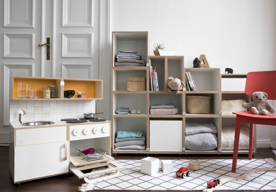 Minimalistisch, ein bisschen 70s-Style und vor allem wandelbar. Die Berliner Firma Stocubo liefert das Pendant zu den pastellfarbenen Küchenträumen für kleine Nachwuchsköche. Klein anfangen, das kann man im wahrsten Sinne des Wortes mit der Stocubo-Kinderküche. Hat man dann noch nicht genug vom Schnippeln und Braten, wird sie einfach nach dem Baukastenprinzip aufgestockt und der junge Starkoch kann so eifrig wie eh und je weitermachen, ohne Haltungsschäden davon zu tragen. Steht der Sprössling irgendwann auf „Fettes Brot“ statt auf Fischstäbchen, lässt sich die Küche in ein Bücherregal oder in ein Nachtkästchen verwandeln.