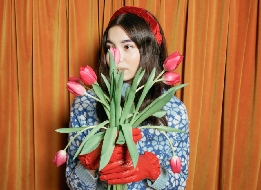 Blumiger Pullovergruß von Mary Quant: Nina trägt ein Modell von ZARA, Haarreif LITTLE LUNA, Handschuhe Vintage