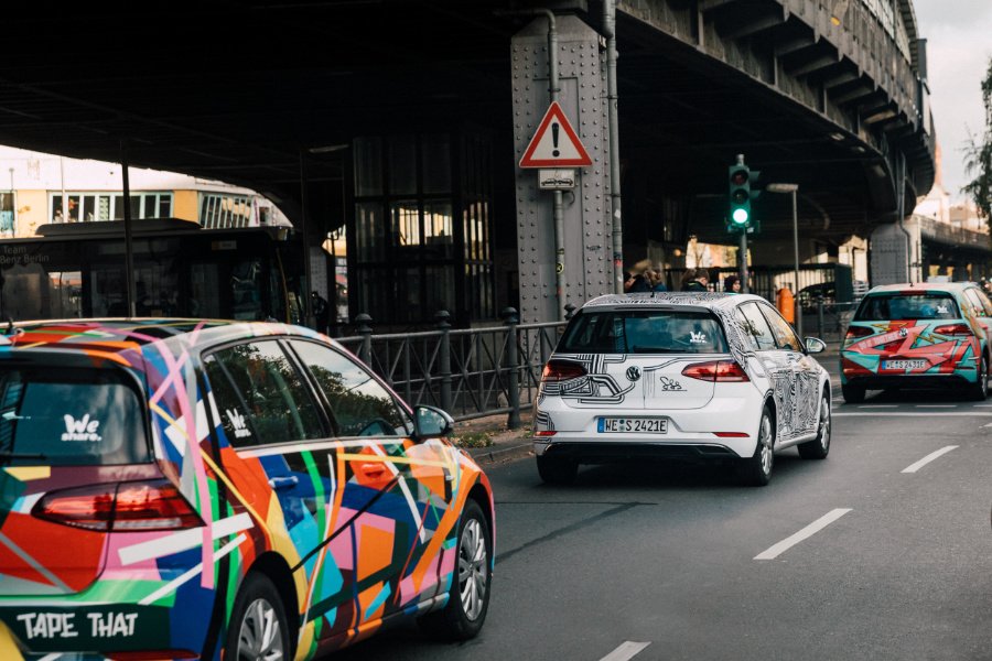 Es braucht schon eine Boygroup, um aus einem blassen e-Golf einen „Popstar“ zu erschaffen … Tape That, das Künstlerkollektiv aus Berlin Kreuzberg, ist bekannt für seine hochgradige Klebewut mit Pop-Art-Effekt. Es war also abzusehen, dass auch der e-Golf von WeShare gründlich was auf die Haube bekommt: Aus einem Berg an bunten Klebebändern entstand expressive Tape-Art und ein rollendes Symbol für die EINHEIT, die immer vielfältig ist …