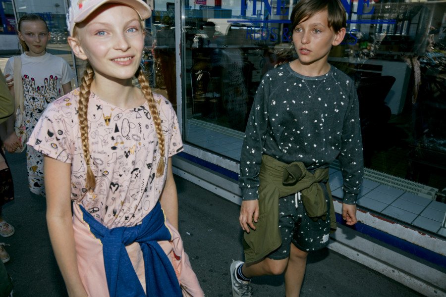 Armyfarben bilden einen coolen Kontrast zu Blumenkleidern oder zur Statement-Bomberjacke aus glänzendem Satin für selbstbewusste Mädels. Dabei haben die Soft Gallery-Designerinnen für ihre „We are Young“-Kollektion nicht nur die Girl Power wiederentdeckt. Auch die Streetwear für Jungs ist stärker und tougher denn je und ganz im Sinne von Boy Power: Wie sonst erklärt man sich ein T-Shirt, welches uns gangsta-like eine geballte Faust mit dem eingestickten Slogan BOYZ entgegenstreckt. Dezenter aber mit genauso viel Street-Credibility kommt das Sweat-Ensemble im Terrazzo-Print daher …