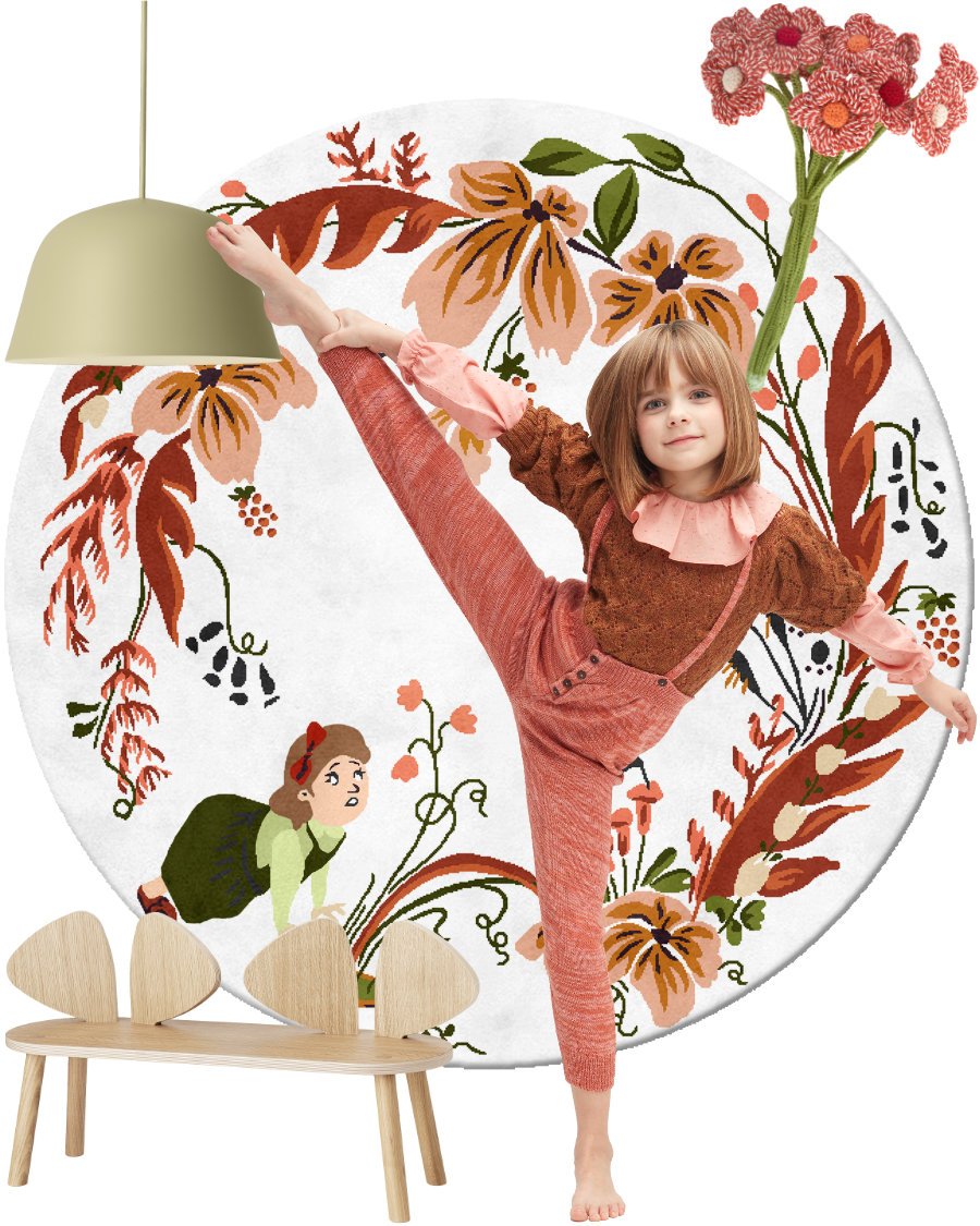 Wie schön, nach einem anstrengenden Schultag auf diesem Teppich die neuen Asanas zu üben … „A Big Big World“-Rug von Studio Sirio | Gehäkeltes Blumenbouquet von Anne-Claire Petit | Bluse von Oeuf NYC | Pointelle-Strickpullover von Oeuf NYC | Trägerhose von Oeuf NYC | Sitzbank „Mouse Bench“ von Nofred | Pendelleuchte Ambit von Muuto.