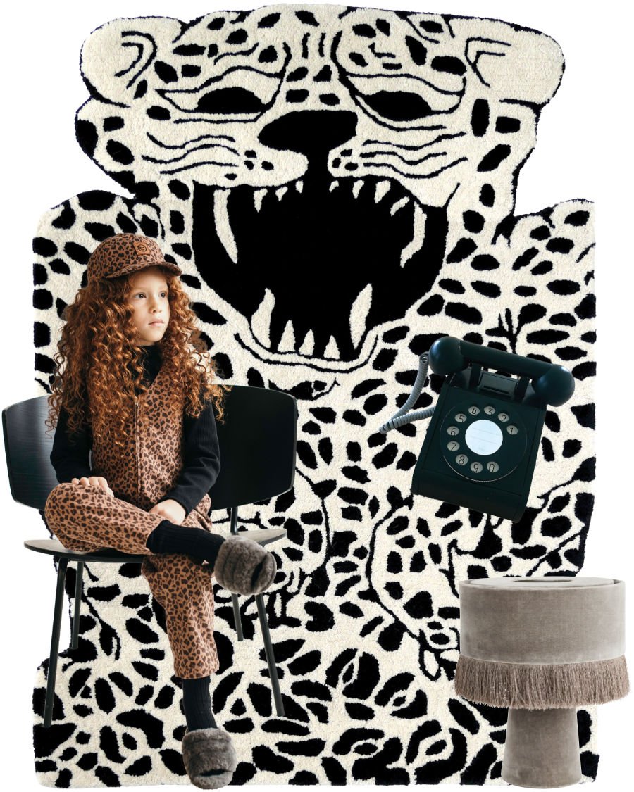 Der Teppich-Klassiker schlechthin für die ausgedehnte Telefon-Session im Vintage-Look … Leopard-Wollteppich von EO Play | Spieltelefon aus Holz von Kiko+ & gg* | Tischlampe Velvet von Madam Stoltz | Leo-Baseballcap von Wynken | Leo-Overall von Wynken | Rollkragen-Rippshirt von Wynken.