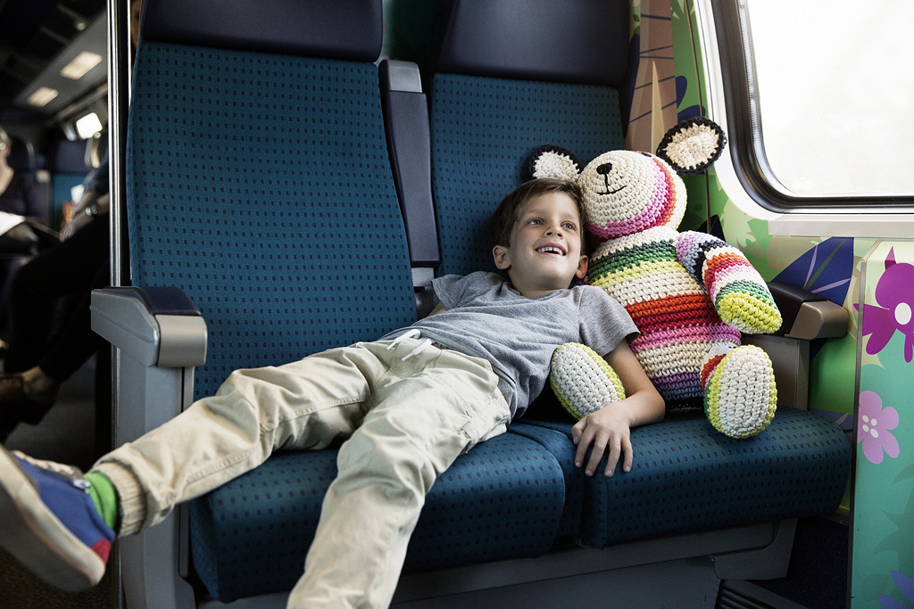 Schon das Einsteigen in den Waggon ist hier irgendwie anders. Statt des gewohnten SBB-Logos oder cooler Sprayer-Kunst tröten Elefanten, flattern bunte Papageien, dazu die Aufschrift „Ticki Park“. Man reibt sich verwundert die Augen: Ticken die noch richtig, die Schweizer? Drinnen dann ein noch farbenfroheres Szenario aus dem wilden Wald und dazu ganz viel Platz: für eine Rutsche beispielsweise, auf der sich die Kinder austoben können, Platz zum Rumrennen und Platz für Windeltasche, Snake-Board und die ganze Hardware, die eine Familie mehr im Gepäck hat – verglichen mit Leuten, die ohne Kids verreisen.