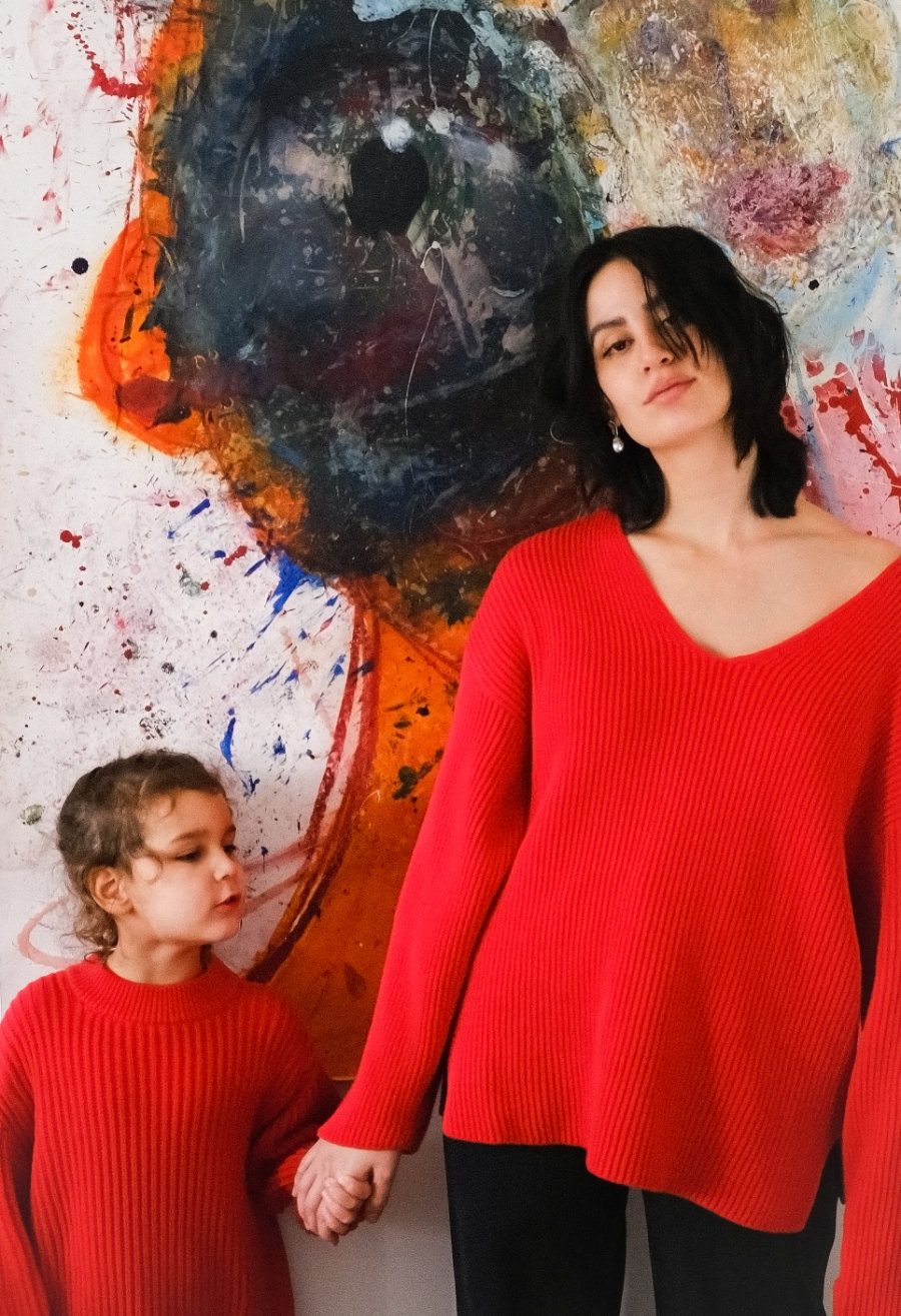 Aus demselben Garn gestrickt: Philia und Aurora lieben den granatapfelroten Sweater aus Bio-Baumwolle