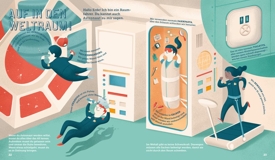 Was genau machen Astronauten eigentlich den lieben langen Tag? Warum müssen sie überhaupt einen Raumanzug tragen? Gibt es auf der Raumstation auch mal Spaghetti Bolognese oder Käsespätzle? Wo in aller Welt schlafen sie? Und wie kann man sich im Weltall überhaupt die Haare waschen? Steve Parker und Andrea De Santis erklären mit ihrem Sachbuch Space Kids den Alltag eines Weltraumfahrers sehr anschaulich, immer wunderschön farbenfroh illustriert und ohne die kleinen Leser mit allzu vielen Informationen zu überfordern.