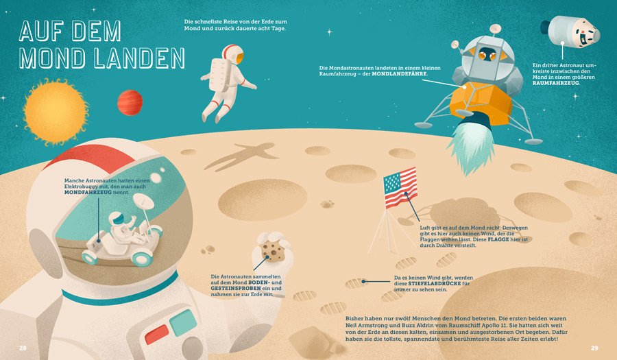 Vom Aufbau einer Rakete über das Innere der Raumstation ISS bis zur detailgenauen Beschreibung eines Raumanzugs. In „Space Kids“ finden zukünftige Astronautenschüler viele interessante Antworten auf ihre brennenden Fragen. Und wie hieß nochmal der erste Astronaut, der den Mond betreten hat? Auch die Meilensteine der Raumfahrt, wie zum Beispiel die Mondlandung der Apollo 11, werden in Space Kids erwähnt …