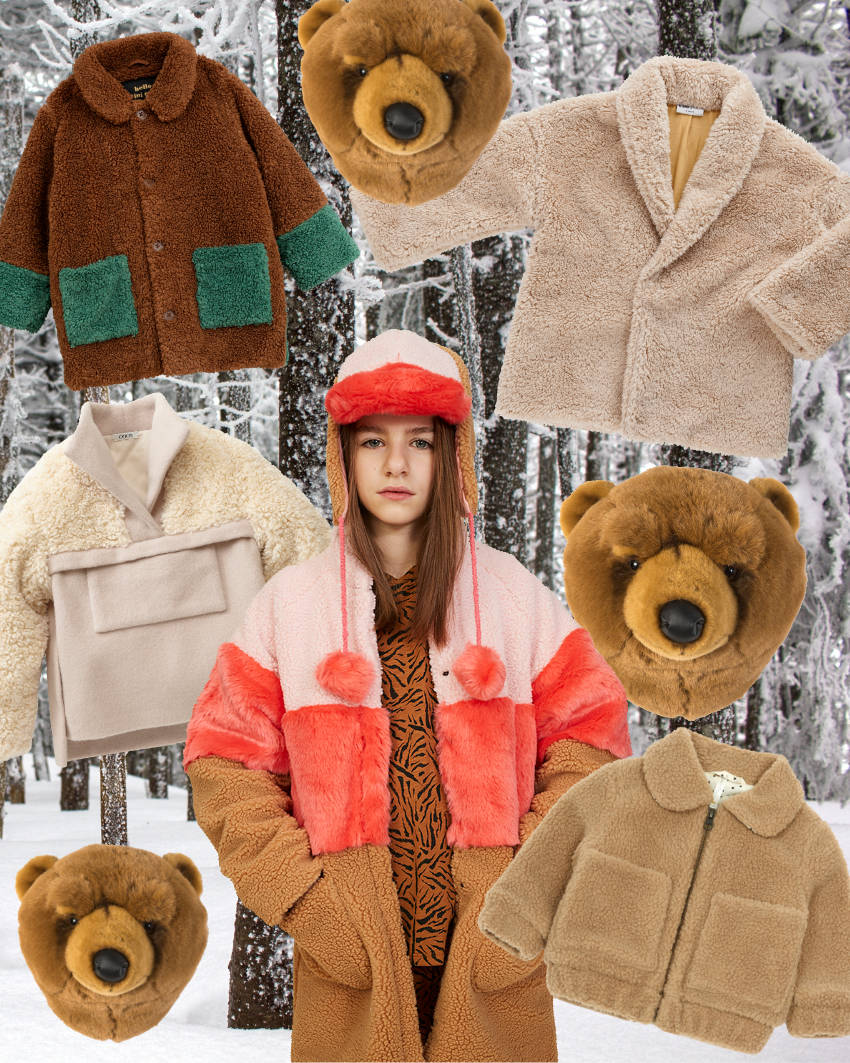 Mollig warme Teddy Winterjacken für Kinder (von oben nach unten im Uhrzeigersinn): Teddy-Jacke von Maed for Mini | Bär-Trophäe von Wild & Soft | Teddyfell-Jacke von Rylee + Cru | Teddy-Mantel von Soft Gallery | Pullover Jacket von Once | Faux-Fur Jacke von Mini Rodini.