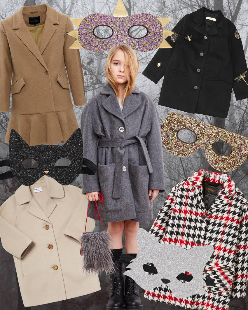 Eine willkommene Alternative zu den üblichen Winterjacken für Kinder sind diese klassischen Retro-Modelle (von oben nach unten im Uhrzeigersinn): Bestickter Wollmantel von Soft Gallery | Superhelden-Maske von Mimi & Lula | Hahnentritt-Mantel von Finger in the Nose | Wolf-Maske von Obi Obi | Wollmantel von Miss L. Ray | Wollmantel von Maed for Mini | Katzen-Maske von Obi Obi | Wollmantel von Little Remix | Dinosaurier-Maske von Mimi & Lula.