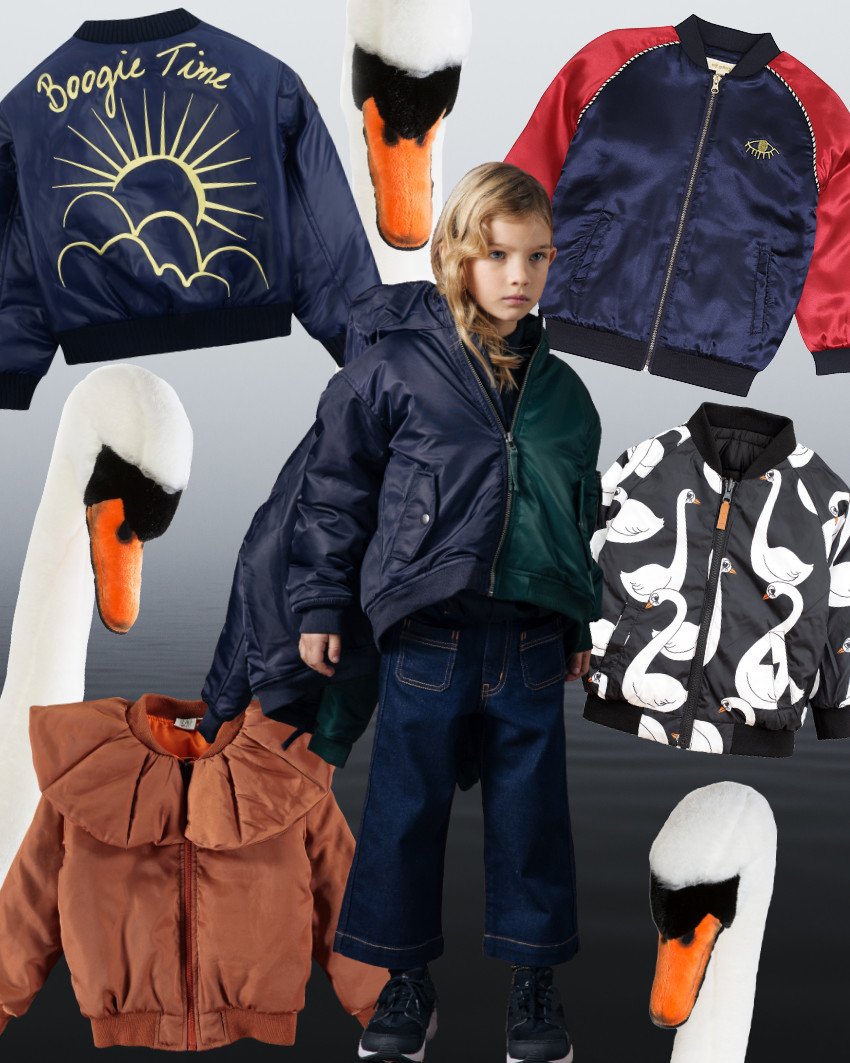 Burschikos und zugleich mädchenhaft, Winterjacken für Kinder im Bomber-Style (von oben nach unten im Uhrzeigersinn): Bomber-Jacke von Soft Gallery | Wendejacke von Mini Rodini | Hoodie-Bomberjacke (Grün) von Finger in the Nose | Bomber-Jacke von Beau Loves | Bomber-Jacke von Raspberry Plum | Schwan-Trophäe von Wild & Soft.
