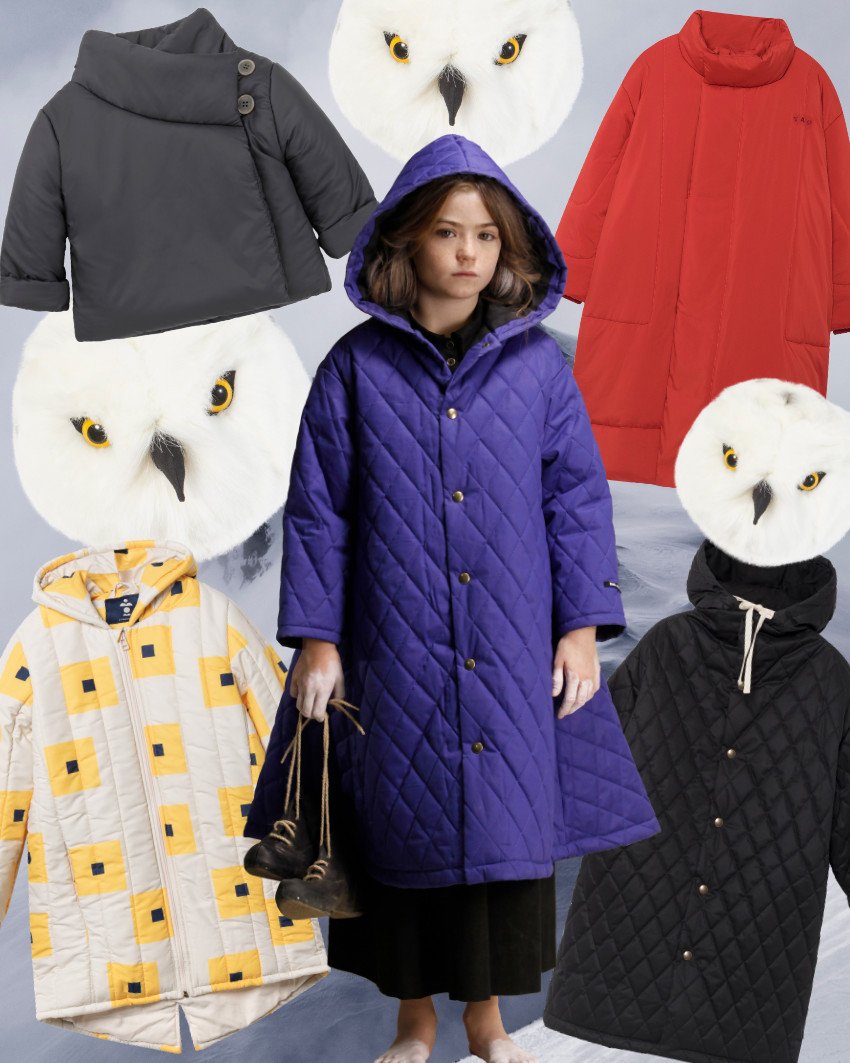 Diese Winterjacken für Kinder halten warm, sehen dabei aber ganz und gar nicht klobig aus (von oben nach unten im Uhrzeigersinn): Daunenjacke von The Animals Observatory | Trophäe Schnee-Eule von Wild & Soft | Stepp-Parka von Little Creative Factory | Stepp-Parka in Cape-Optik von Little Creative Factory | Wattierter Anorak von Bobo Choses | Daunenjacke von 1+ in the family.