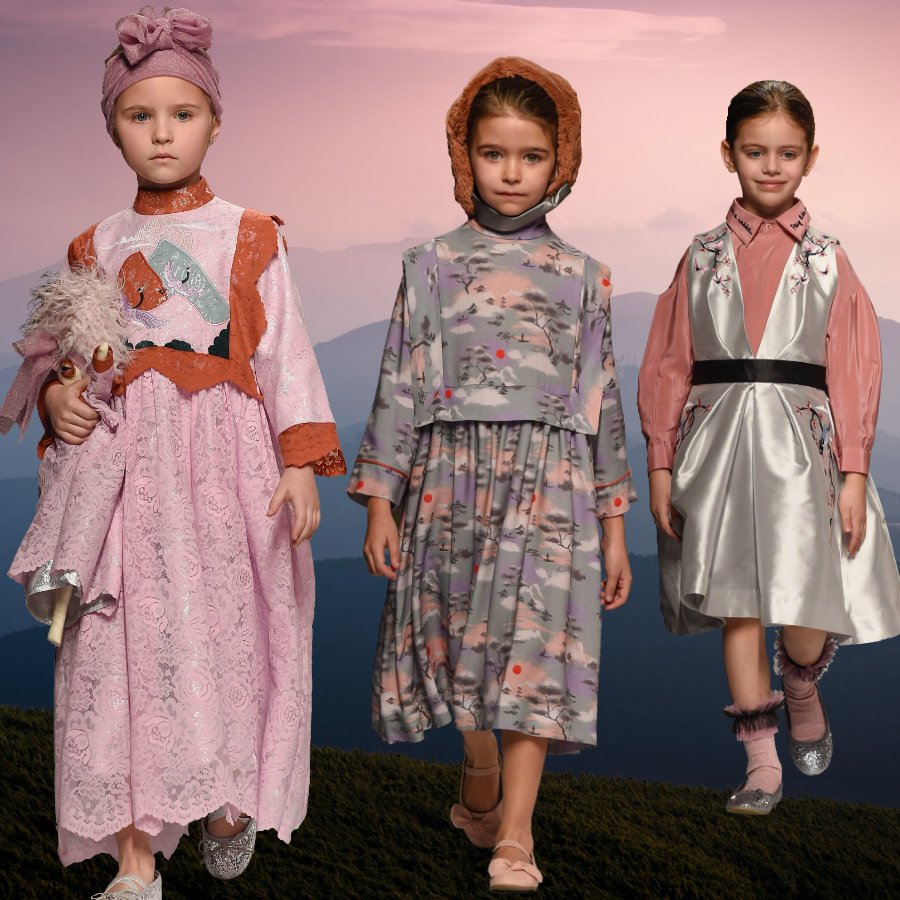 Der Klassenclown der Kindermode ist zahm geworden. Waren Aleksandra Matthews‘ Kollektionen in der Vergangenheit rotzfrech, überraschte sie uns in Florenz mit asiatisch anmutenden Winterlooks in zarten Aquarellfarben. „Dreaming of the East“, so heißt die AW19 Kollektion der Londonerin, ist eine fröhlich-sanfte Hommage an die ostasiatische Volkskunst: Ob koreanischer Hanbok oder japanischer Kimono, Aleksandra Matthews von Raspberry Plum hat die traditionellen Trachten mutig neu interpretiert.