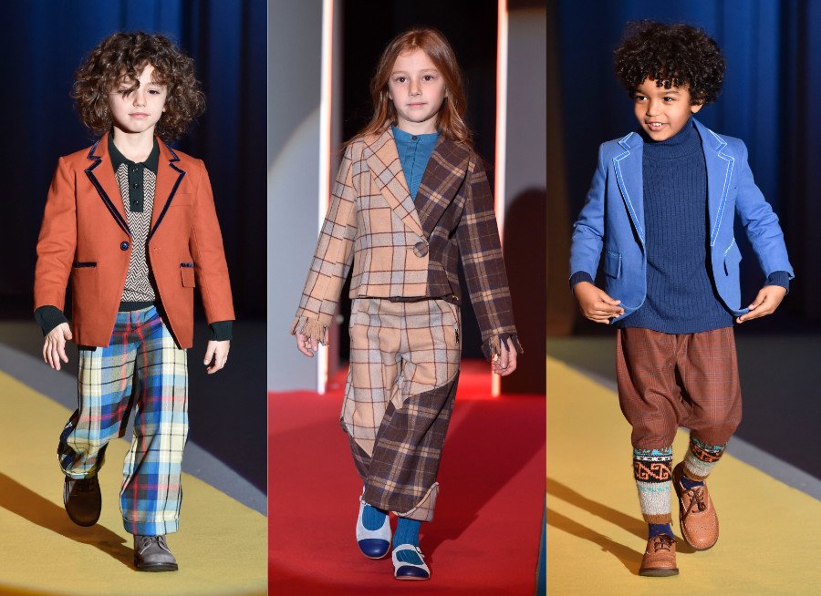 Wintermode-Looks von Mr. Uky (Bild l. und r.), ein jungenhafter Tartan-Anzug für Mädchen von Le Mu (Mitte) © Giovanni Giannoni